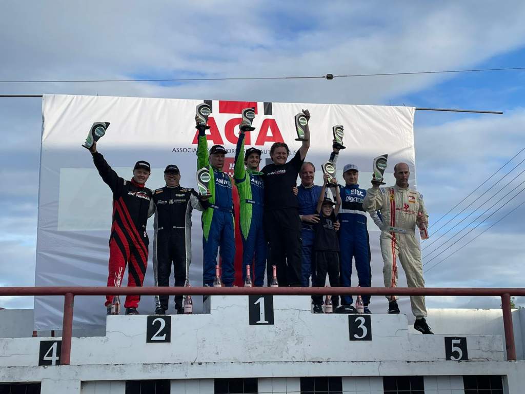 Pilotos Tiel de Andrade e Júlio Martini subiram ao pódio no sábado (8), na primeira etapa do Campeonato Gaúcho de Super Turismo 2023